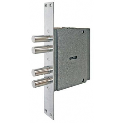 Запирание замка происходит за счет выдвижения четырех стальных ригелей.